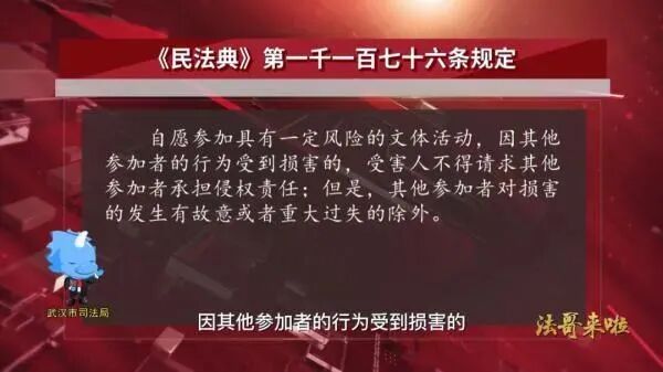 《中华人民共和国民法典》第一千一百七十六条规定:自愿参加具有一定风险的文体活动,因其他参加者的行为受到损害的,受害人不得请求其他参加者承担侵权责任;但是,其他参加者对损害的发生有故意或者重大过失的除外。