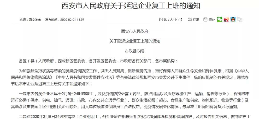 随着新型冠状病毒肺炎的发展,中央及地方政府相继出台延迟企业复工上班的各项通知。中央及地方政府发布的延迟企业复工上班的通知是否具有法律依据?各个企业在此期间如何向劳动者支付劳动报酬,如何进行风险防控?本文立足西安市的实际情况,结合陕西地区有关劳动用工政策和劳动用工特点,撰写而成。 一、2020年1月26日,国务院办公厅发布关于延长2020年春节假期的通知: 1.该通知经国务院授权,由国务院办公厅发布,符合我国现行法律的规定,国务院办公厅有权根据国务院的授权发布该项规范性法律文件,在全国范围内具有普遍约束力,全国各个企业应当遵照执行。 2.该通知比法定假日延长了2天,关于这2天假期的性质,究竟是法定节假日还是休息日? 从《全国年节及纪念日放假办法》第二条第二款的规定以及通知第三条可知,延长的2天假期属于休息日。根据《中华人民共和国劳动法》第四十四条第二款的规定,企业如果安排劳动者工作的,可以安排补休,或者按照工资200%支付劳动报酬。 法条链接: 《全国年节及纪念日放假办法》 第二条 全体公民放假的节日:(二)春节,放假3天(农历正月初一、初二、初三); 《中华人民共和国劳动法》 第四十四条 有下列情形之一的,用人单位应当按照下列标准支付高于劳动者正常工作时间工资的工资报酬: (二)休息日安排劳动者工作又不能安排补休的,支付不低于工资的百分之二百的工资报酬。 二、2020年2月1日,西安市人民政府发布关于延迟企业复工上班的通知: 1.西安市人民政府是否有权发布该通知? 西安市人民政府根据《中华人民共和国传染病防治法》《中华人民共和国突发事件应对法》等有关法律法规和西安市突发公共卫生事件一级响应机制的有关规定发布的《关于迟延企业复工上班的通知》,符合法律法规的相关规范。西安市人民政府有权根据法律法规授权,发布该项法律文件,在全西安市范围内具有普遍约束力,涉及疫情防控必需(药品、防护用品以及医疗器械生产、运输、销售等行业)、保障城市运行必需(供水、供电、油气、通讯、市政、市内公共交通等行业)、群众生活必需(超市、食品生产和供应、物流配送、物业等行业)及其他涉及重要国计民生的相关企业除外,西安市行政区划范围内的各个企业应当遵照执行。 法条链接: 《中华人民共和国传染病防治法》 第四十二条 传染病暴发、流行时,县级以上地方人民政府应当立即组织力量,按照预防、控制预案进行防治,切断传染病的传播途径,必要时,报经上一级人民政府决定,可以采取下列紧急措施并予以公告: (二)停工、停业、停课。 2.通知中2月3日至2月9日,这7天是属于节假日还是休息日?延迟复工期间工资如何支付?延迟复工期间企业能不能提前复工,能不能安排员工在家办公?在家办公有没有加班费?目前上海市、广东省人力资源与社会保障局就迟延复工期间的有关问题作出解答,那么西安市各个企业如何应对迟延复工。 (1)延迟复工是出于疫情防控需要,这几天属于休息日。 根据陕西省人力资源和社会保障厅《关于妥善处理新型冠状病毒感染的肺炎疫情防控期间劳动关系问题的通知》以及《陕西省工资支付条例》第二十五条,用人单位停工停业,未超过一个工资支付周期的,应当按照劳动合同约定的工资标准支付劳动者工资。用人单位停工停业,超过一个工资支付周期的,对没有解除劳动合同,也没有安排工作的劳动者,应当按照不低于当地最低工资标准的75%支付劳动者生活费。故企业在2月3日至2月9日应当按照劳动合同约定的工资标准支付劳动者工资。 如果企业在这期间安排劳动者工作的,根据《中华人民共和国劳动法》第四十四条第二款的规定,企业在休息日安排劳动者工作的,可以安排补休,或者按照工资200%支付劳动报酬。 (2)除涉及疫情防控必需(药品、防护用品以及医疗器械生产、运输、销售等行业)、保障城市运行必需(供水、供电、油气、通讯、市政、市内公共交通等行业)、群众生活必需(超市、食品生产和供应、物流配送、物业等行业)及其他涉及重要国计民生的相关企业外,其他企业不能提前复工,更不能要求劳动者返回工作岗位正常工作,否则,将会违反我国《中华人民共和国突发事件应对法》《中华人民共和国劳动合同法》等多部法律的规定,如因提前复工导致疫情严重的,企业将会面临刑事、行政、民事各方面法律责任。 企业可以安排员工在家办公,但是应当安排补休,或者按照工资200%支付劳动报酬。 法条链接: 《全国年节及纪念日放假办法》 第二条 全体公民放假的节日:(二)春节,放假3天(农历正月初一、初二、初三); 《陕西省工资支付条例》 第二十五条 用人单位停工停业,未超过一个工资支付周期的,应当按照劳动合同约定的工资标准支付劳动者工资。用人单位停工停业,超过一个工资支付周期的,对没有解除劳动合同,也没有安排工作的劳动者,应当按照不低于当地最低工资标准的75%支付劳动者生活费。 《中华人民共和国劳动法》 第四十四条 有下列情形之一的,用人单位应当按照下列标准支付高于劳动者正常工作时间工资的工资报酬: (二)休息日安排劳动者工作又不能安排补休的,支付不低于工资的百分之二百的工资报酬。 《中华人民共和国突发事件应对法》 第六十四条 有关单位有下列情形之一的,由所在地履行