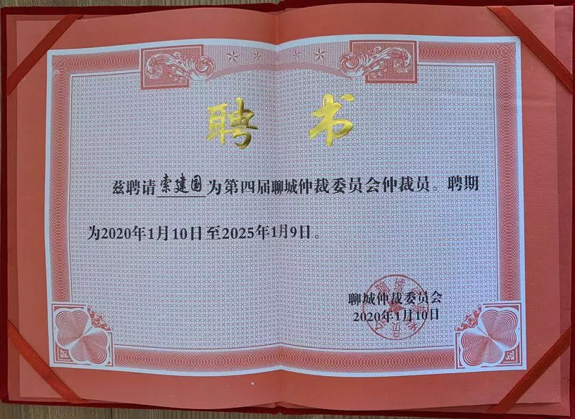索建国律师 获聘山东聊城仲裁委员会仲裁员, 为仲裁事业继续奋斗。